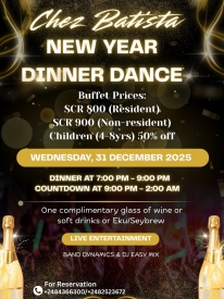 WEDNESDAY 31ST DECEMBER 7PM / NEW YEAR DINNER DANCE / CHEZ BATISTA / BAIE LAZARE, MAHE
