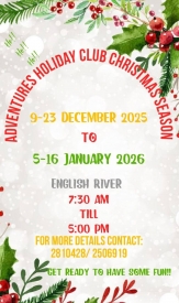 9TH DECEMBER TO 16TH JANUARY 7.30AM TO 5PM / ADVENTURES HOLIDAY CLUB CHRISTMAS SEASON / CONTACT 281 0428 or 250 6919