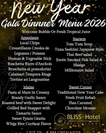 WEDNESDAY 31ST DECEMBER / NEW YEAR GALA DINNER MENU & LIVE DJ / BLISS HOTEL, GLACIS MAHE