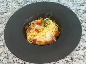 PASTA CARBONARA > Spaghetti, bacon, parmesan cheese & black pepper served in an egg cream sauce