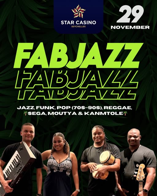 FABJAZZ is back at Star Casino Seychelles this 29 November, bringing you an electric mix of Jazz, Funk, Pop (70s–90s), Reggae, Sega, Moutya & Kanmtole