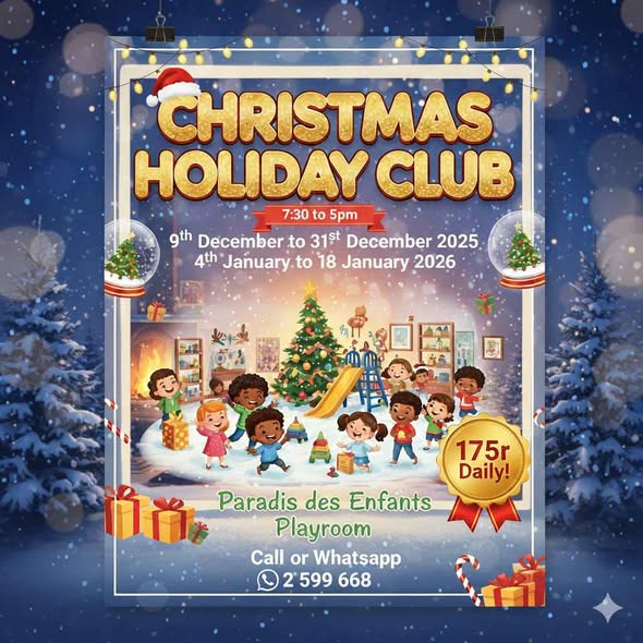 4TH DECEMBER TO 18TH JANUARY / CHRISTMAS HOLIDAY CLUB 7.30 AM TO 5PM / PARADIS DES ENFANTS PLAYROOM WHATSAPP 259 96 68