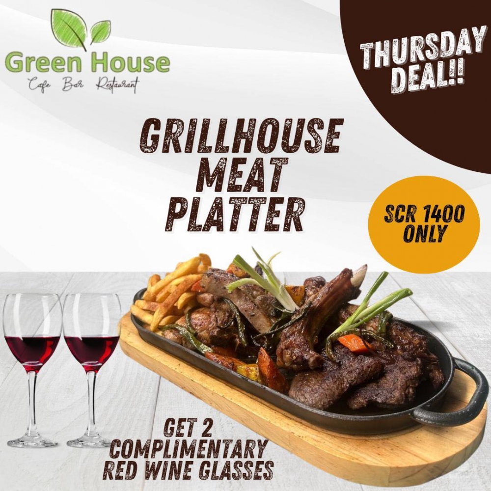 Enjoy our hearty GRILLHOUSE Platter and sip on 2 free glasses of red - only at Greenhouse Restaurant Seychelles
