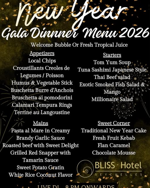 Step into 2026 with a feast made for the occasion. Our New Year’s Gala Dinner brings together Creole touches, fresh seafood, bold flavours and a sweet corner you won’t want to leave. Live DJ from 8 PM to keep the night glowing.