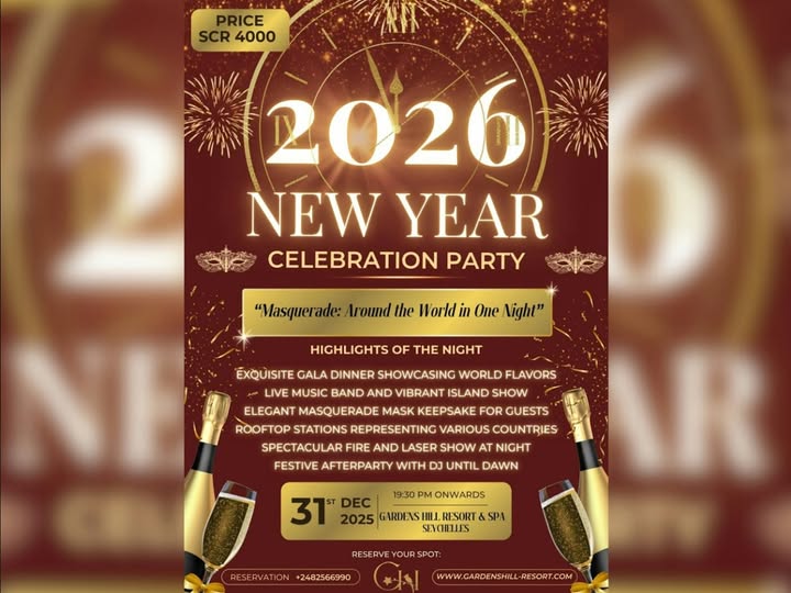 WEDNESDAY 31ST DECEMBER 7.30 PM ONWARDS / 2026 NEW YEAR CELEBRATION PARTY / GARDENS HILL RESORT & SPA, BEAU VALLON, MAHE