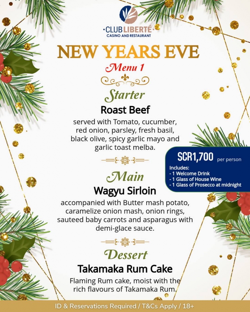 WEDNESDAY 31ST DECEMBER / NEW YEAR'S EVE MENU 1 / CASINO LIBERTE / BAIE LAZARE, MAHE