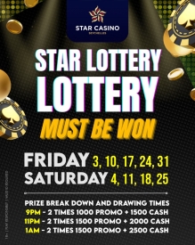 The Star Lottery – MUST BE WON with BIG cash & promo prizes! ⏰ Draw Times: 9PM – 2x 1000 Promo + 1500 Cash 11PM – 2x 1500 Promo + 2000 Cash 1