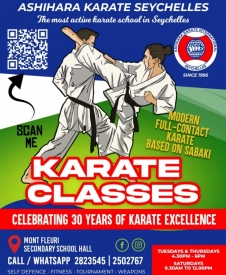 KARATE CLASSES FOR KIDS / TUESDAYS & THURSDAYS 4.30PM TO 6PM / SATURDAYS 9.30 AM TO 12PM / MONT FLEURI SECONDARY SCHOOL HALL