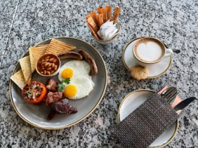 ENGLISH BREAKFAST >Baked beans, tomatoes, bacon, egg of your style, black pudding & sausages