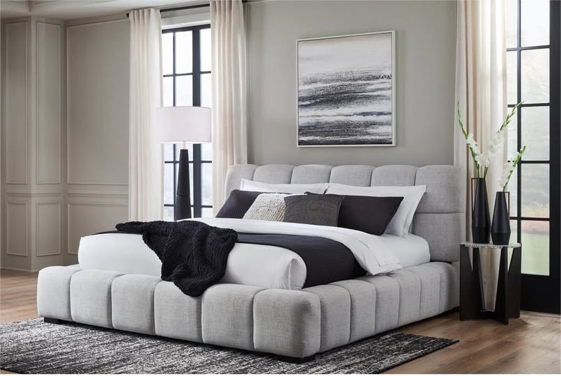 Merging casual and contemporary design this upholstered bed is the upgrade you've been wishing for. Plush and with an impressive design that's just as comfortable as it is stylish. The text light grey Next-Gen Nuvella performance fabric is tough and easy to clean.